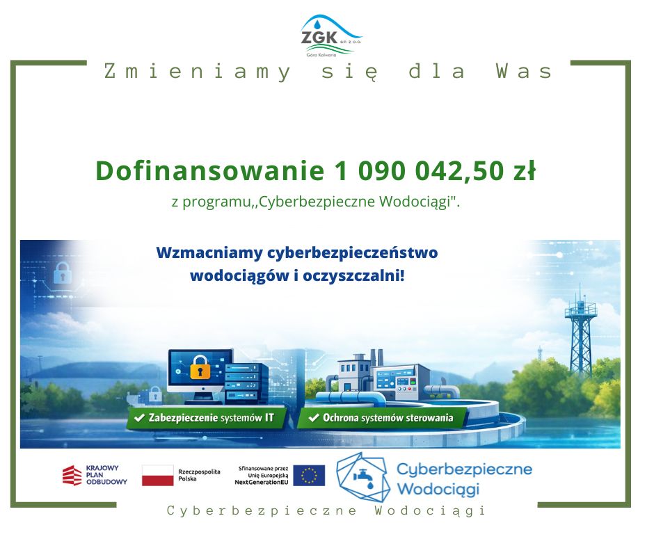 Wzmacniamy cyberbezpieczeństwo wodociągów i oczyszczalni Dziś otrzymaliśmy informację o przyznaniu Zakładowi Gospodarki Komunalnej w Górze Kalwarii dofinansowania w wysokości 1 090 042,50 zł w ramach konkursu „Cyberbezpieczne Wodociągi”. Pozyskane środki przeznaczymy na: zabezpieczenie systemów IT ochronę systemów sterujących pracą wodociągów i oczyszczalni ścieków Realizacja projektu pozwoli ograniczyć ryzyko awarii i zakłóceń w dostawach wody, a […]