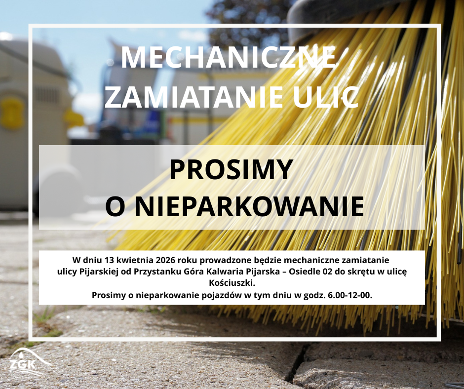 WAŻNE! Zamiatanie ulic – Prosimy o nieparkowanie pojazdów przy ul. Pijarskiej od Przystanku Góra Kalwaria Pijarska – Osiedle 02 do skrętu w ulicę Kościuszki w dniu 13 kwietnia 2026 roku w godz. 6.00-12.00.