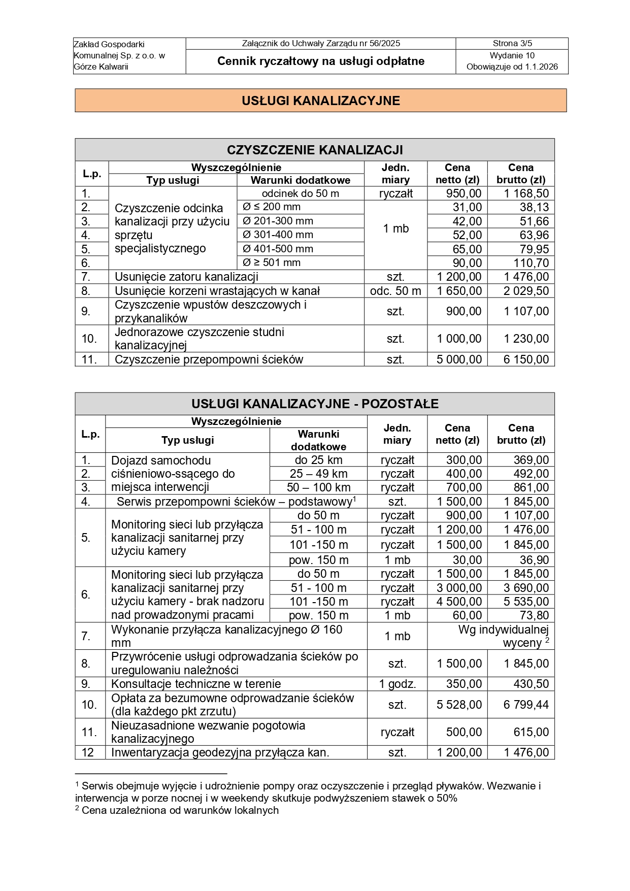 - Cennik obowiązujący od 1.01.2026- usługi kanalizacyjne