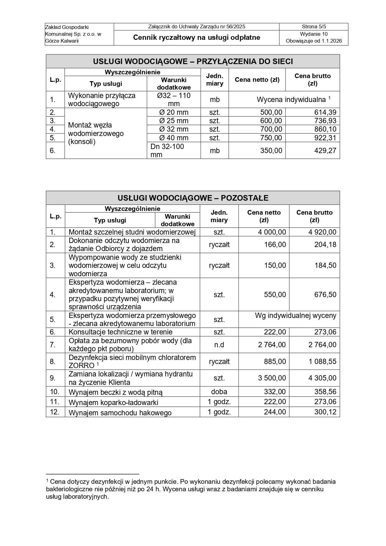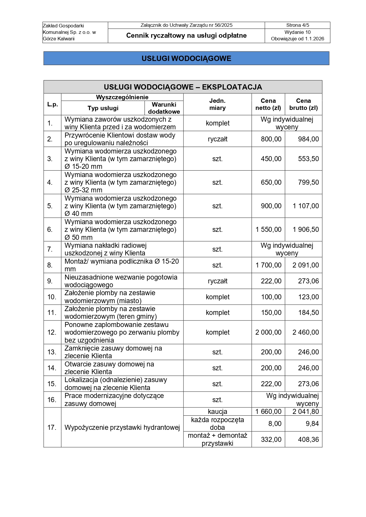 - Cenniki obowiązujący od 1.01.2026- usługi wodociągowe